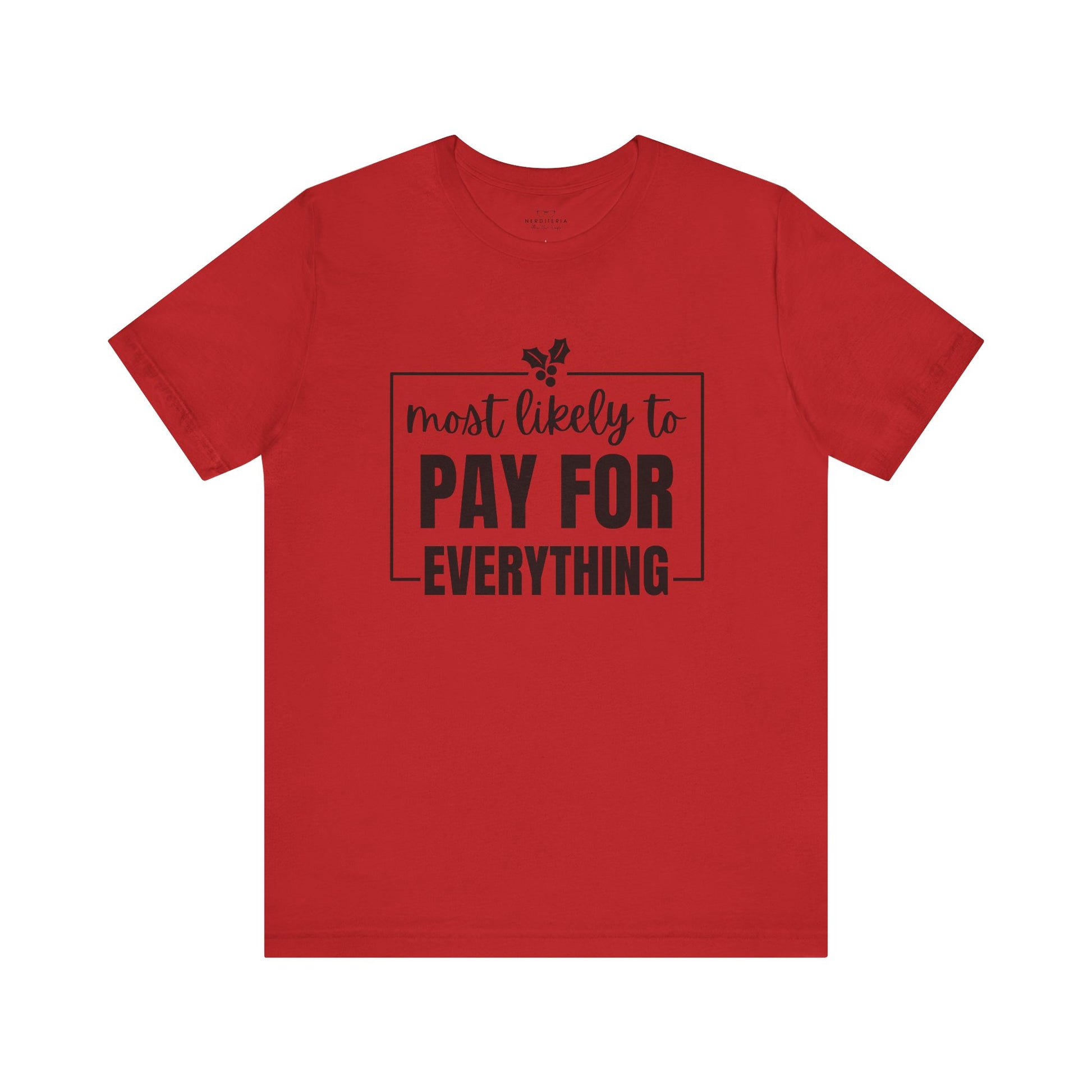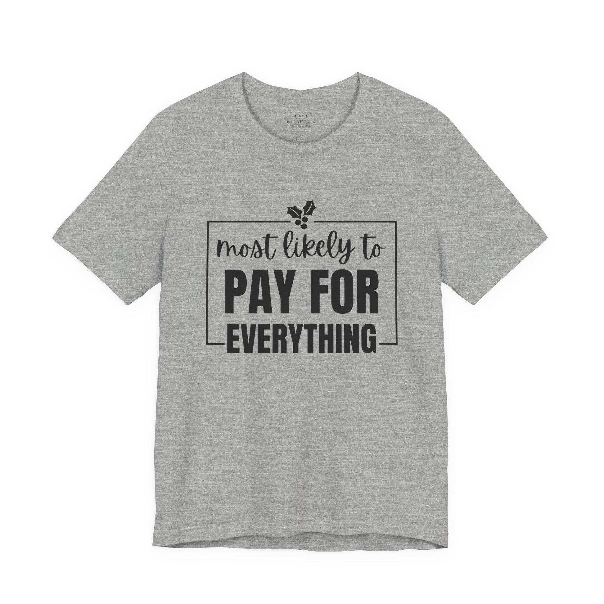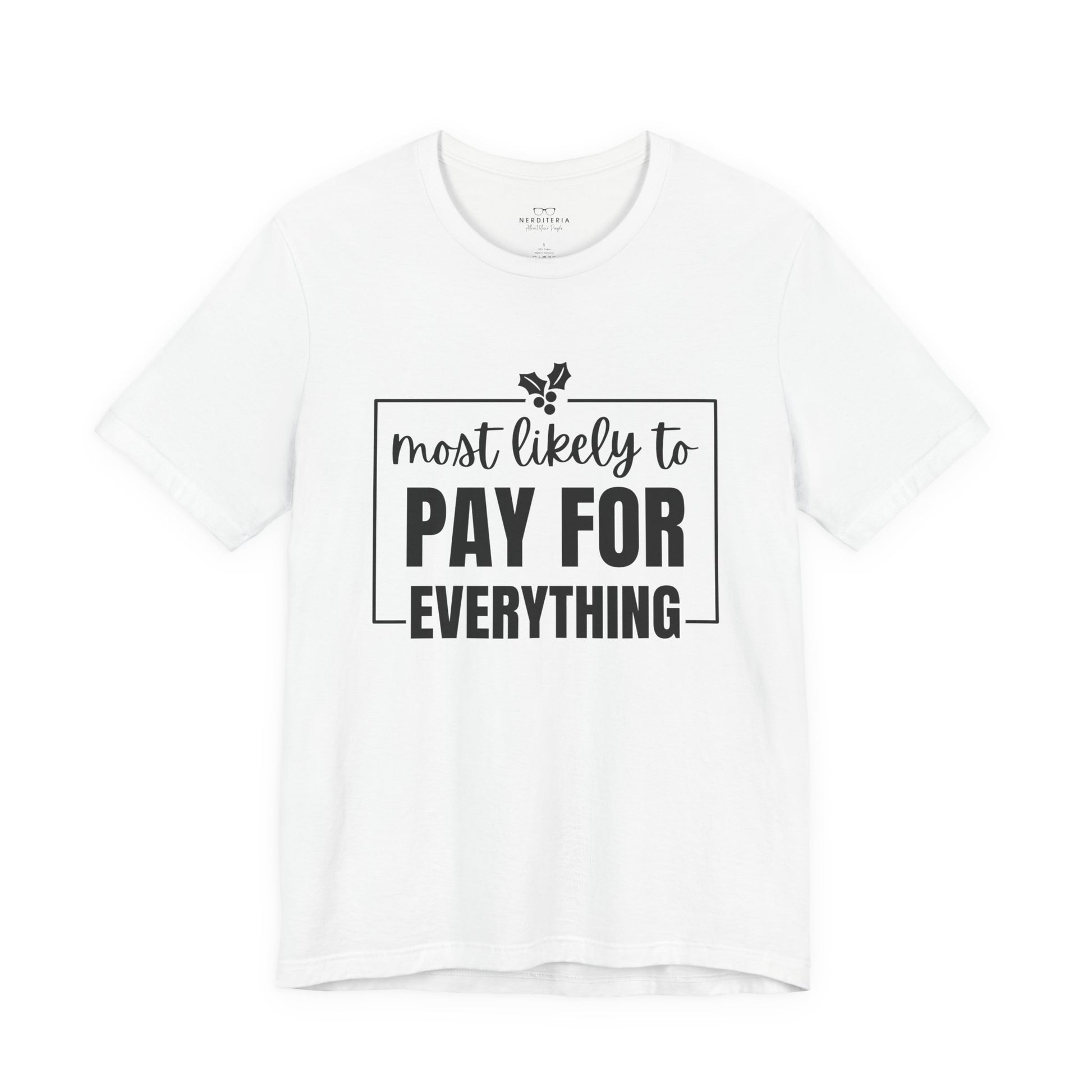 Perfect for Dad or Mom as a funny holiday gag gift. Pair it with holiday pj's for a memorable holiday joke. A soft, lightweight tee with a cheeky, confident message: “most likely to PAY FOR EVERYTHING.” The clean monochrome design sits centered on a breathable 100% Airlume combed and ring-spun cotton body that layers easily under jackets or wears solo. Tailored with side seams, shoulder tape, and a ribbed knit collar for long-lasting shape, it stays comfortable and sharp through everyday use. The sleeve and neck print use modern DTF/DTG techniques for crisp lettering and a smooth finish.