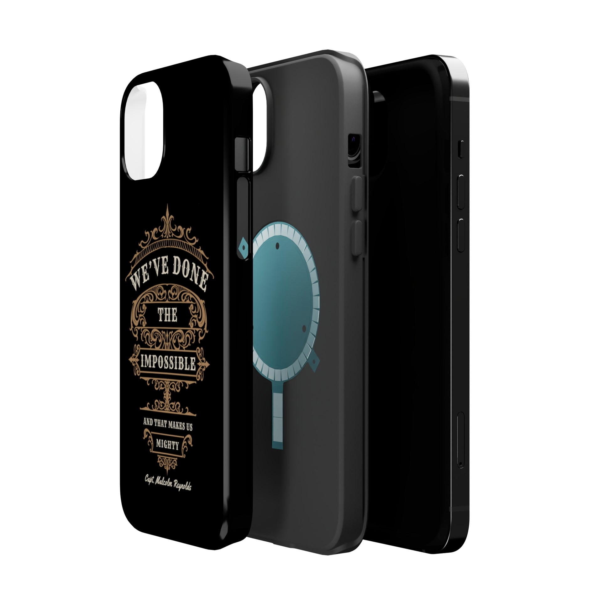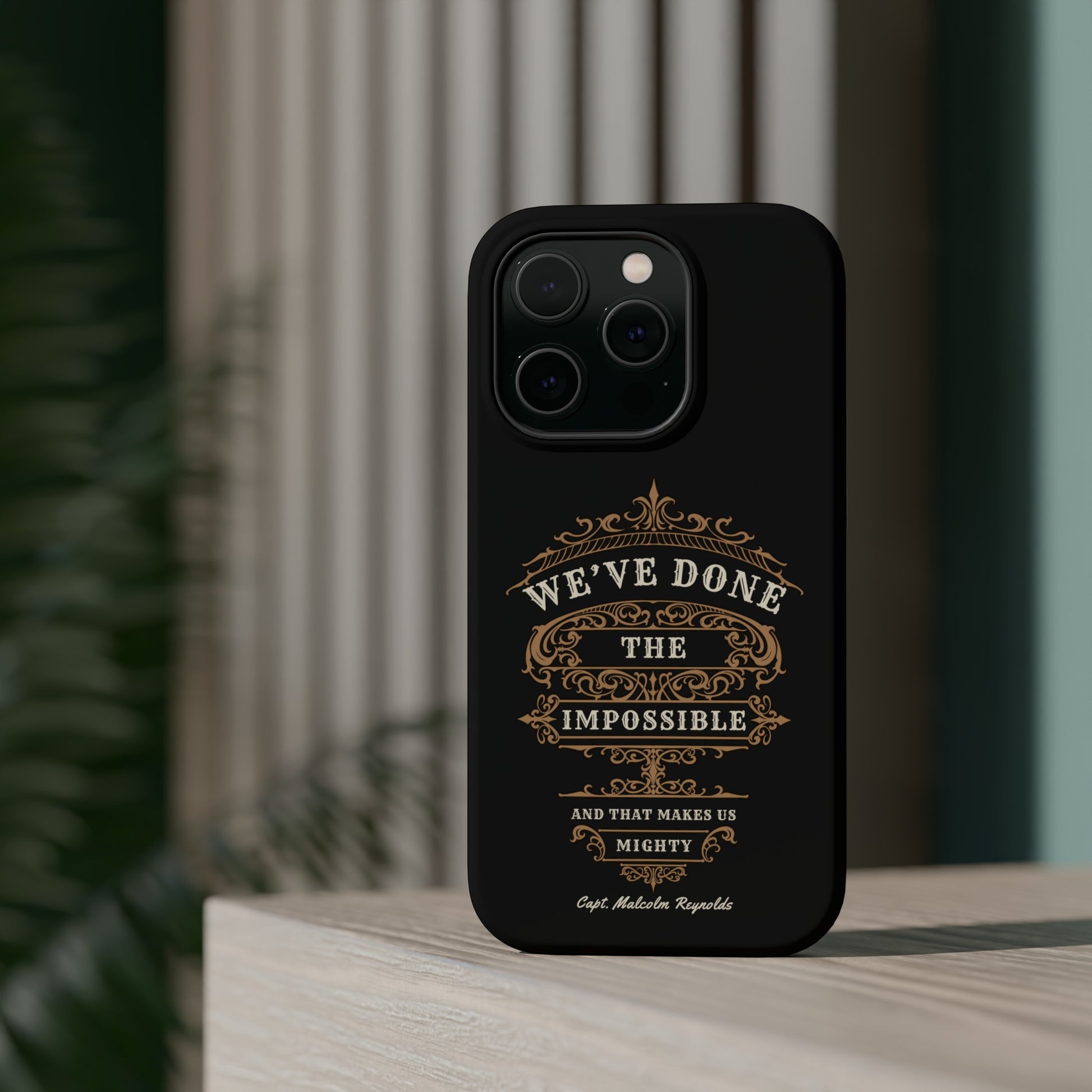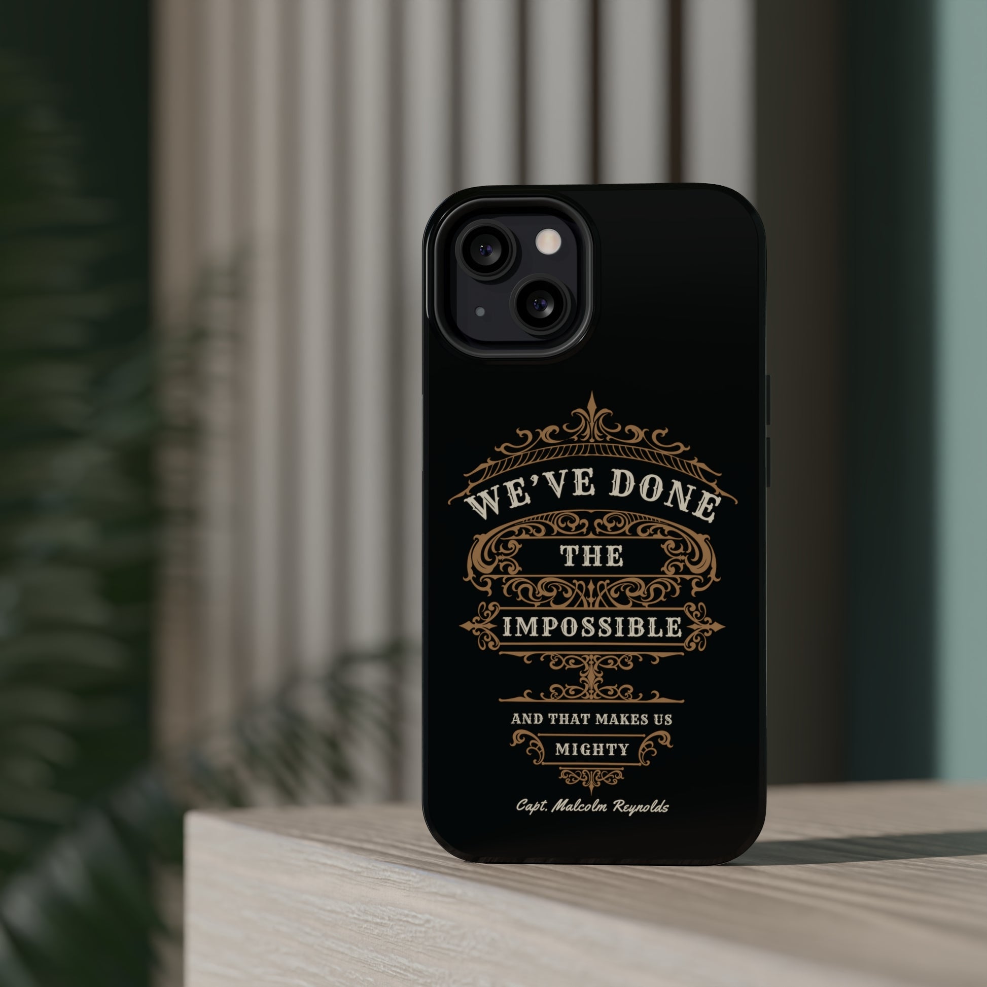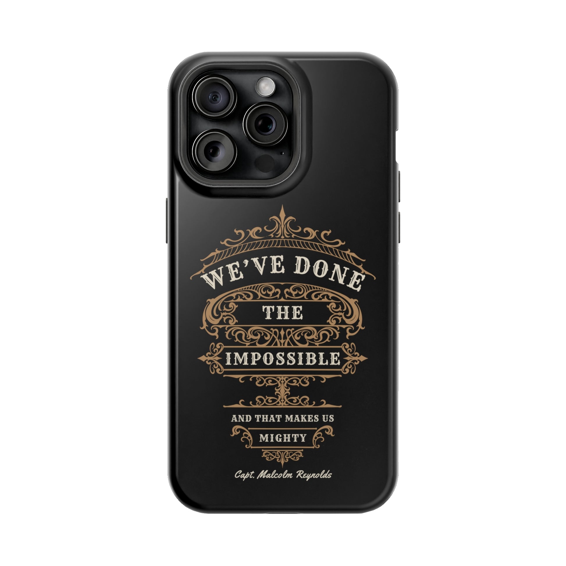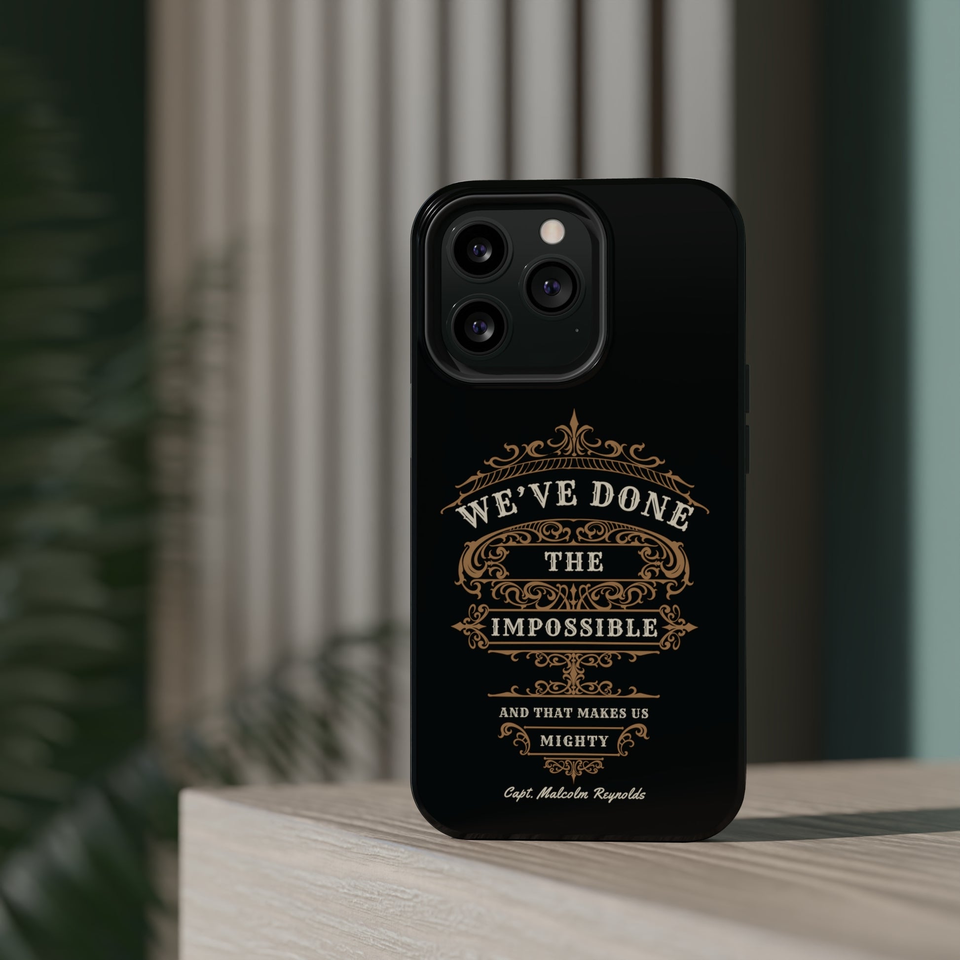 "We've done the impossible, that makes us mighty." A quote that good should go everywhere with you. Where better than on your phone case? Show off your love for Firefly and the wisdom of Captain Malcolm Reynolds with this unique Nerditeria-only design. MagSafe and tough as Captain Tightpants himself. Browncoats unite!