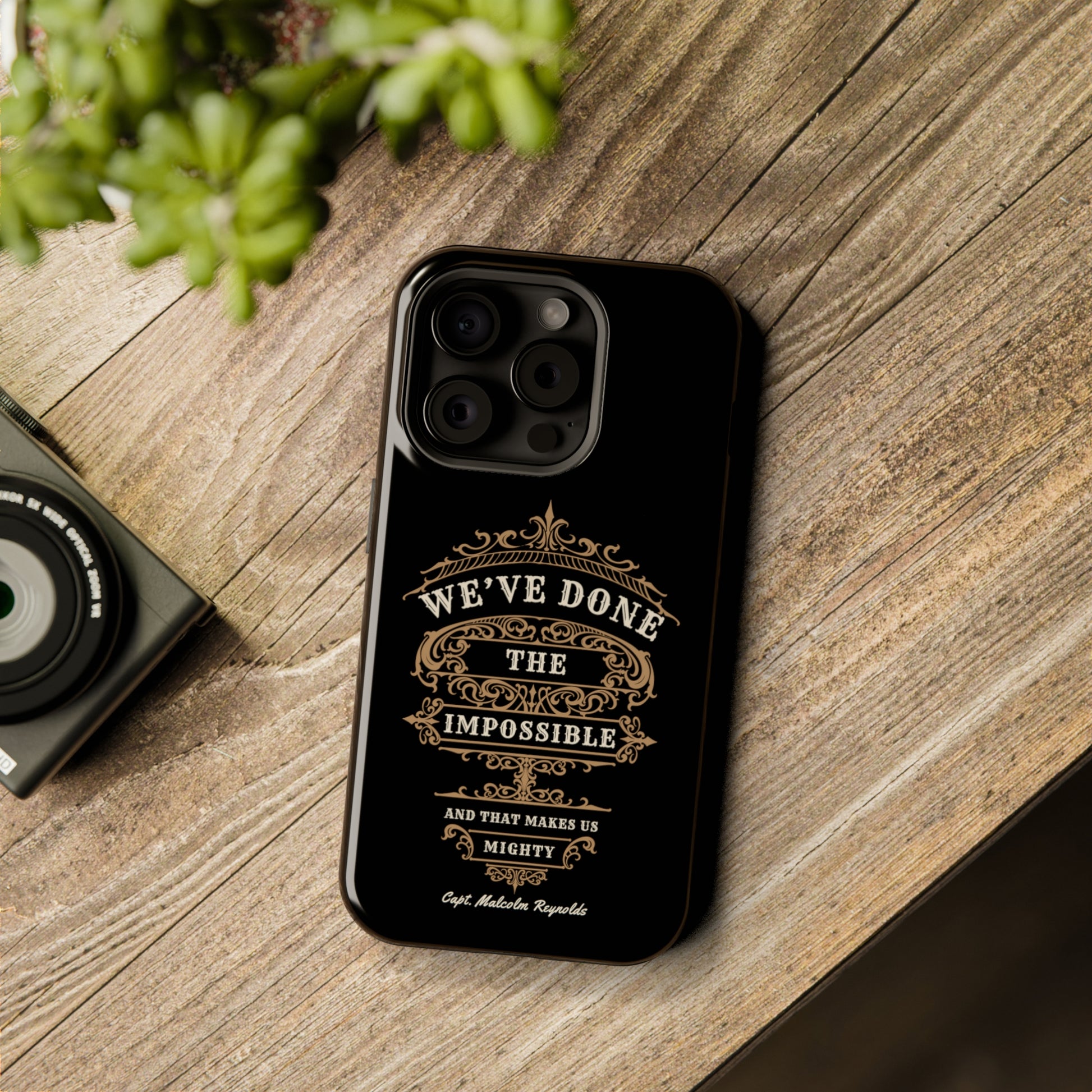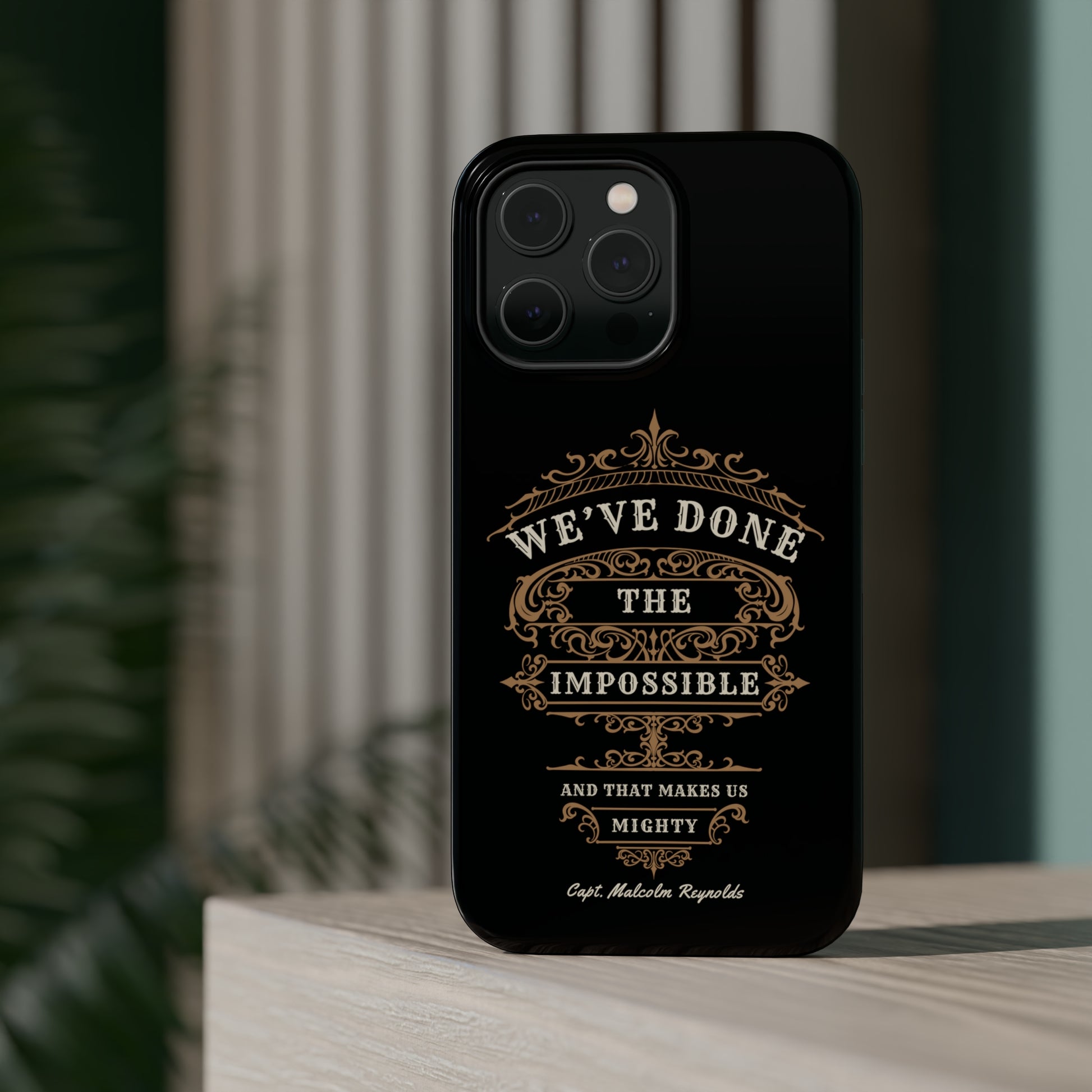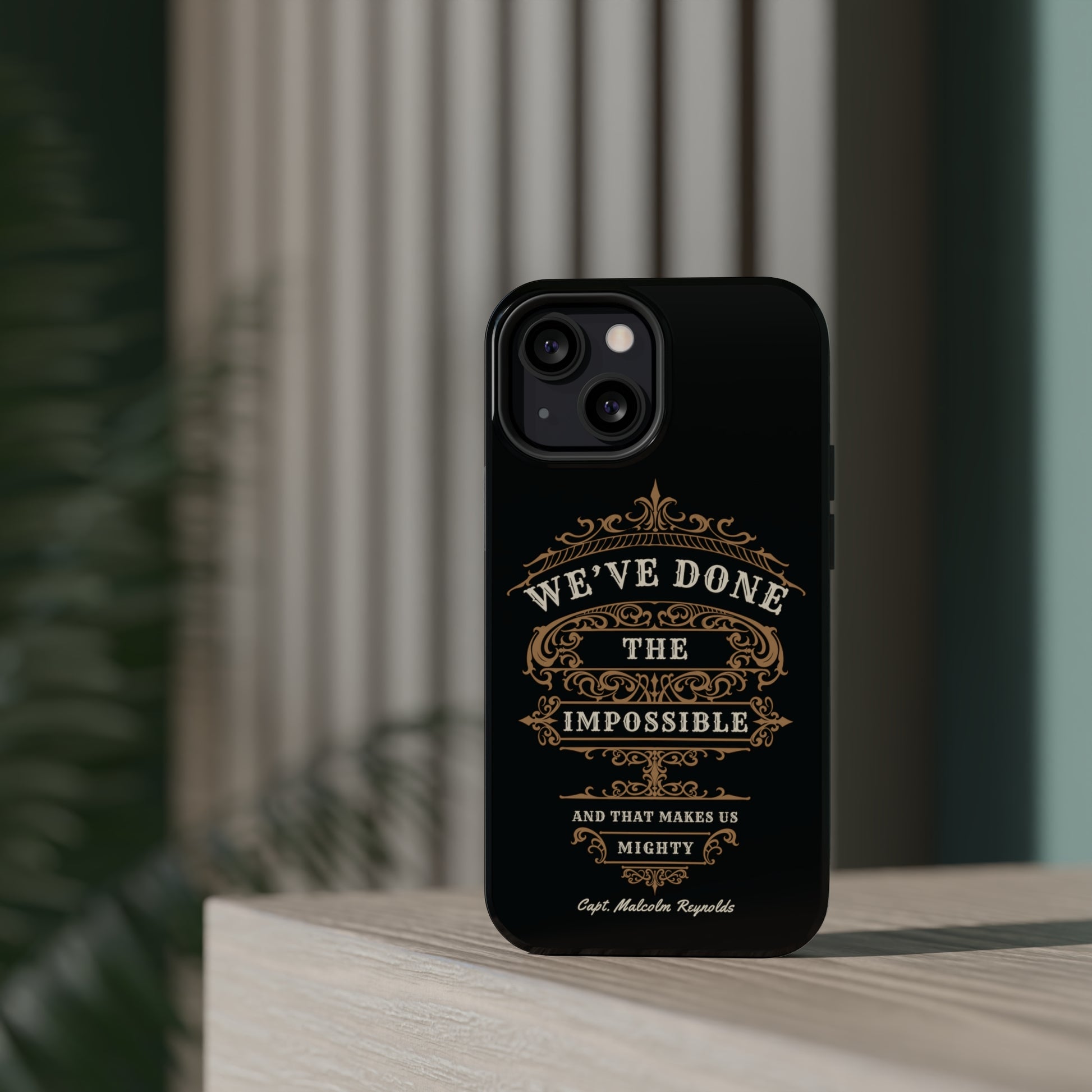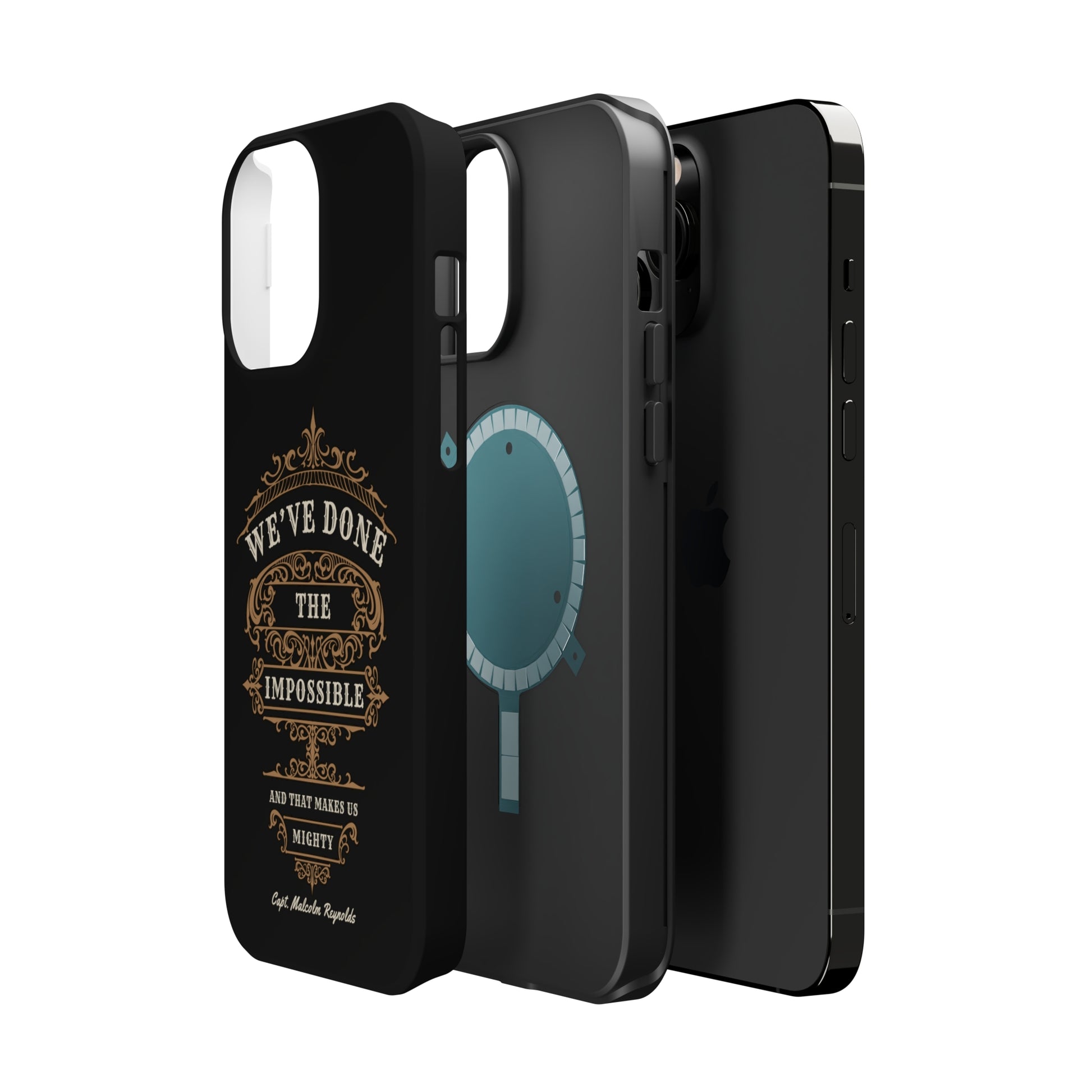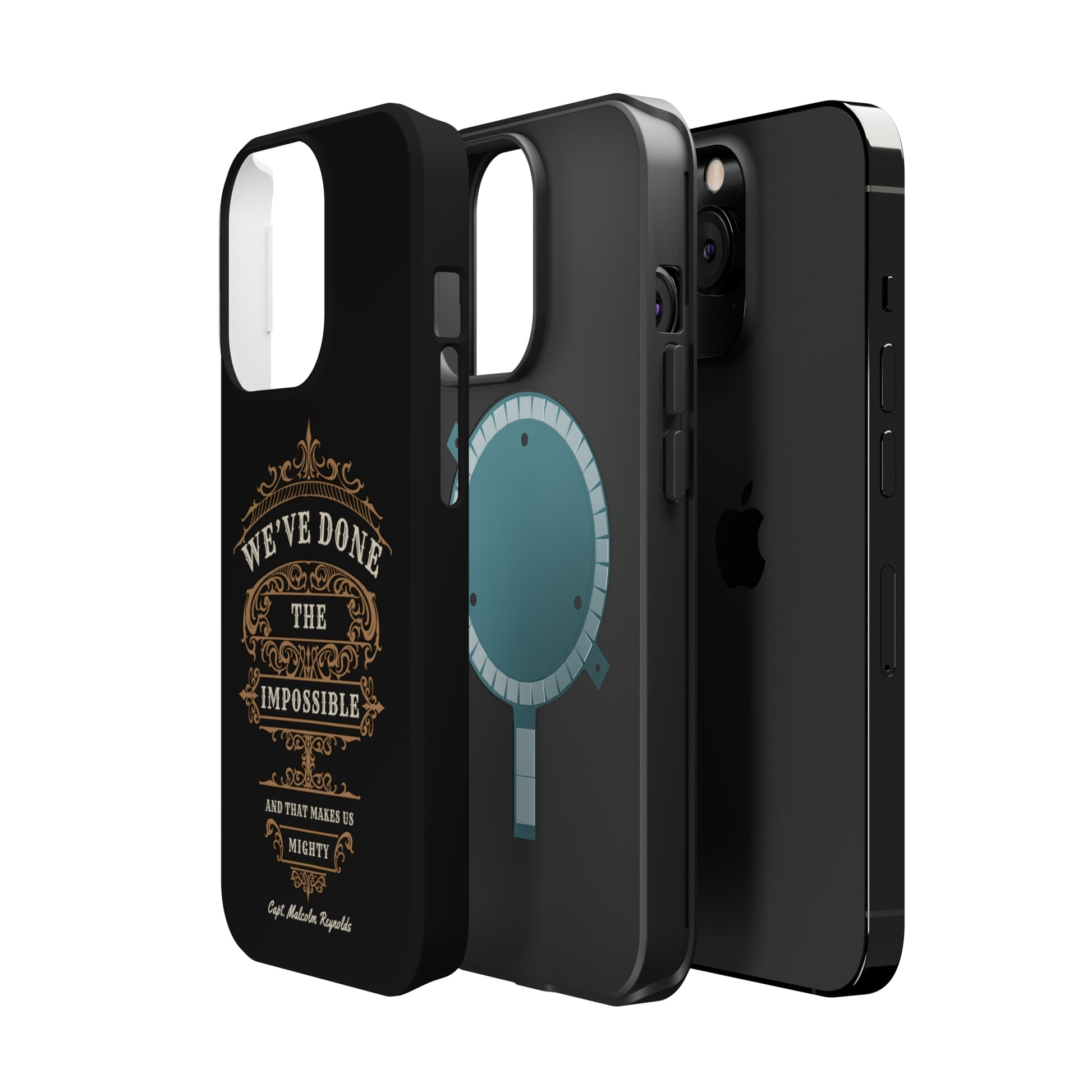 "We've done the impossible, that makes us mighty." A quote that good should go everywhere with you. Where better than on your phone case? Show off your love for Firefly and the wisdom of Captain Malcolm Reynolds with this unique Nerditeria-only design. MagSafe and tough as Captain Tightpants himself. Browncoats unite!